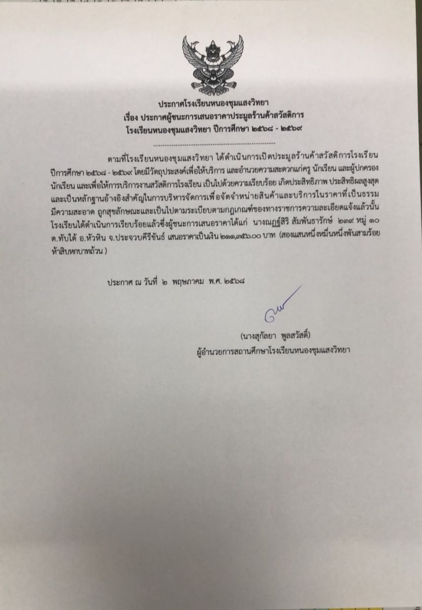 ประกาศผู้ชนะการเสนอราคาประมูลร้านค้าสวัสดิการ โรงเรียนหนองชุมแสงวิทยา ปีการศึกษา 2568-2569